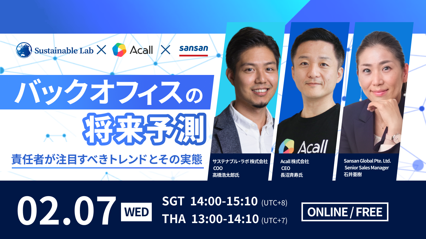 コーポレート人材が押さえておきたい、ESG経営の潮流サステナブル・ラボ株式会社:高橋 浩太郎 氏非財務データプラットフォーム「TERRAST(テラスト)」を提供しつつ、日本で唯一の「サステナブル企業名鑑」を標榜する新たなメディアも2024年1月にローンチするなど、ESG/SDGs業界を牽引する企業の1社。 持続可能なハイブリッドワークを実現するためのオフィスと働き方Acall株式会社:長沼 斉寿 氏オフィスワークとリモートワークを支える代表的なインフラプレーヤーとして、7,000社以上にサービス導入実績があり、昨年大型資金調達も実施。そのマーケットをシンガポールを中心としたアジアに積極的に広げて展開中。 変わりゆく外的環境と、請求書管理DXのあり方Sansan Global Pte. Ltd:石井亜樹社内の名刺を一元管理することで営業DXを世界60カ国以上で推進してきたSansan。現在は、タイとシンガポールにおいて、バックオフィスDXに寄与する請求書管理サービス「BillOne」を強化して展開中。 |